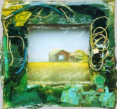 (3) "TUNNELBLICK durch STRAND-'GUT'", 50 x 50 x 15 cm, Acryl auf Leinwand (umrahmt von "ewigem" Müll), (4) "VON DER LATTE zur PLATTE", 55 x 45 x 10 cm, Acryl auf Leinwand (umrahmt von Plastik-Wand-Teilen).